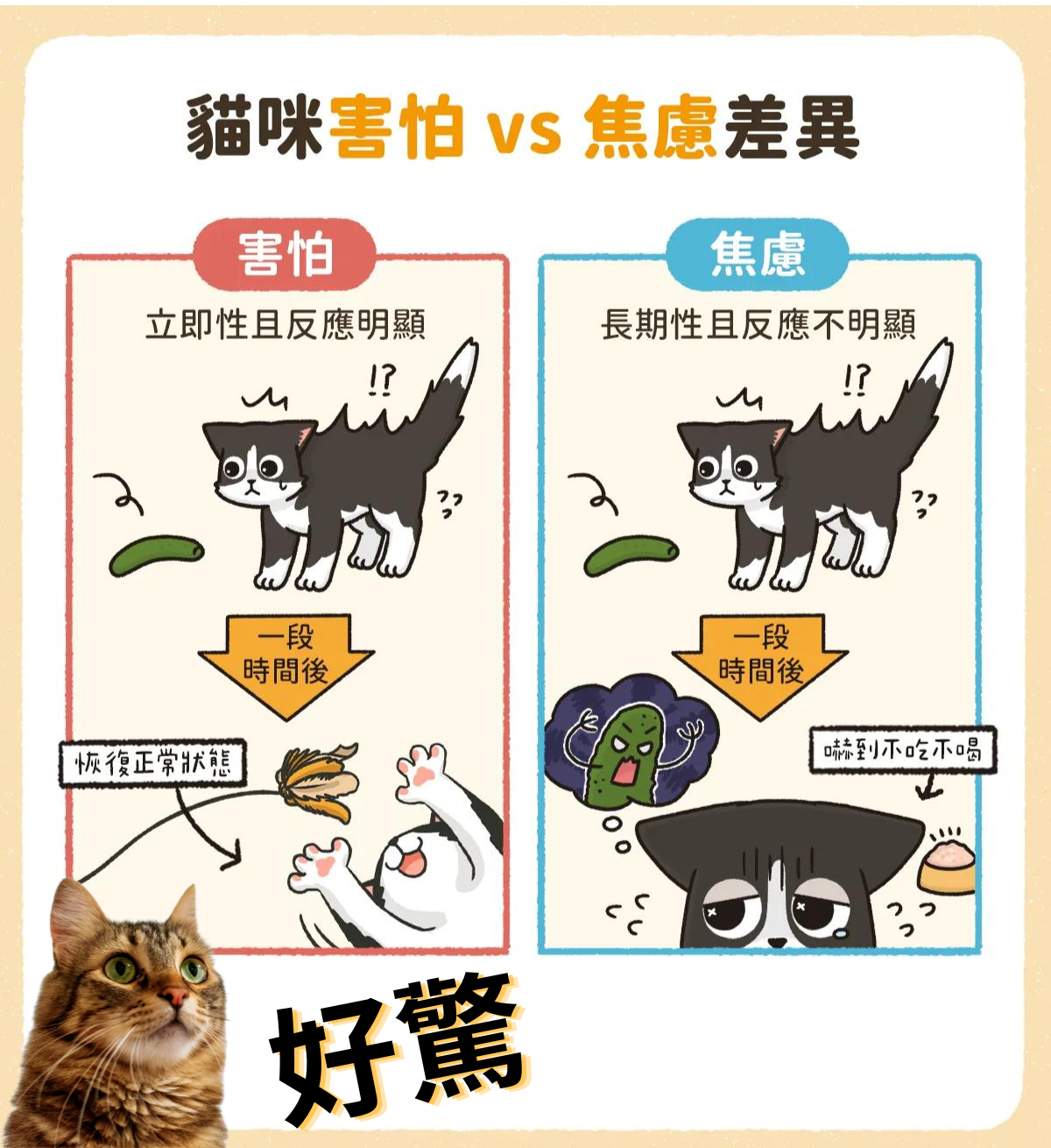 貓咪害怕是立即性且⾏為反應明顯;焦慮則是長期性且⾏為不明顯,所以容易被忽略略,聽起來有點難理解,簡單的舉例就可以快速明白害怕與焦慮的差異。