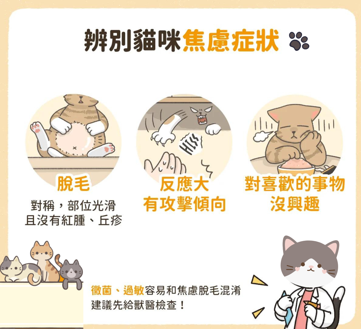 通常脫毛部位光滑、對稱、沒有傷口紅疹,較高機率是⼼因性的過度理毛(焦慮)。不過黴菌脫毛也容易被誤會是焦慮,發現貓咪脫毛時,建議先給獸醫檢查是否為健康問題喔!