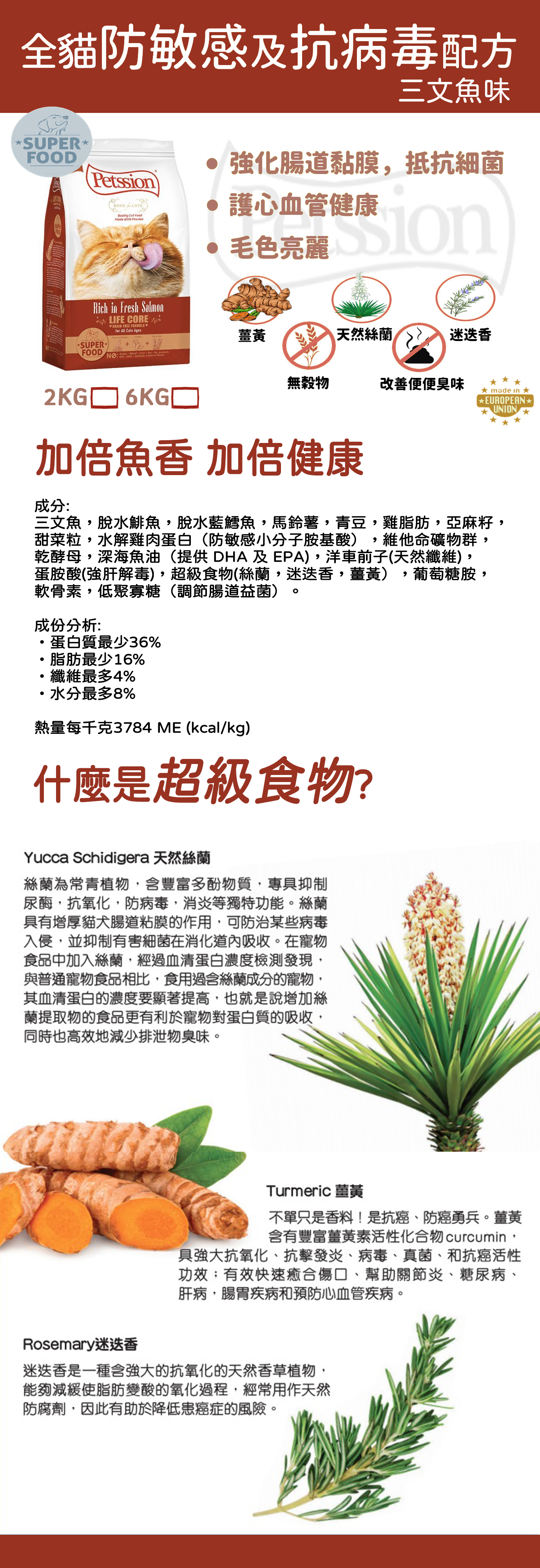 成份:三文魚,脫水鯡魚,脫水藍鱈魚,馬鈴薯,青豆,雞脂肪,亞麻籽,甜菜粒,水解雞肉蛋白(防敏感小分子胺基酸),維他命礦物群,乾酵母,深海魚油(提供 DHA 及 EPA),洋車前子(天然纖維),蛋胺酸(強肝解毒),超級食物(絲蘭,迷迭香,薑黃),葡萄糖胺,軟骨素,低聚寡糖(調節腸道益菌)。