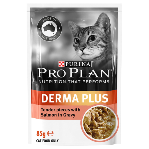 Pro Plan Derma Plus 濕貓糧經過科學配製,100% 完整且均衡,包含成年貓所需的所有基本營養,包括有助於保持健康體重的最佳蛋白質和脂肪水平,以及支持強大免疫系統的成分。 Derma Plus 含有 Omega 3 脂肪酸,有助於促進健康的皮膚和閃亮的皮毛,以及有助於限製過度脫落的鋅和甲硫氨酸。 它是用真正的鮭魚和美味的肉汁製成的,味道鮮美,您的貓會喜歡。