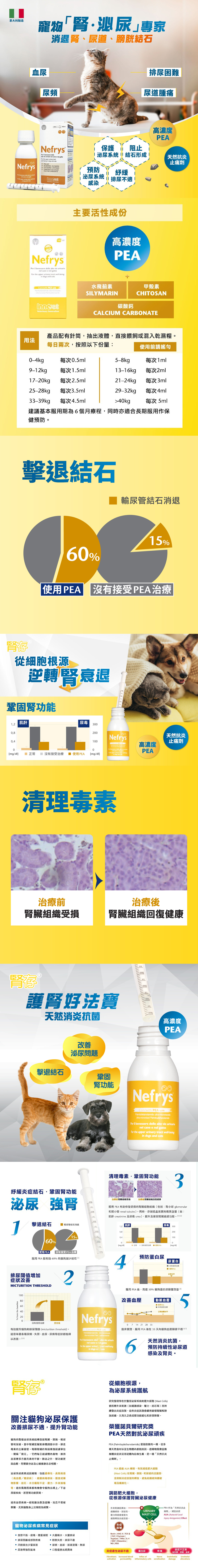· 強腎配方含高濃度液態 PEA (palmitoyle-thanolamide) 天然脂肪酸,針對腎衰貓狗。