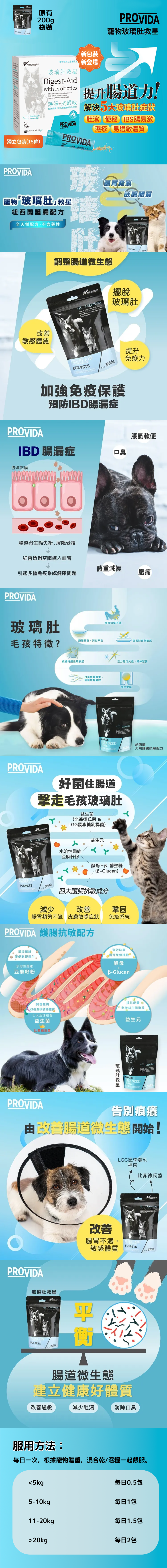 ProVida®玻璃肚救星含四大活性益生菌組合,亞麻籽粉,酵母和益生元,助整腸,抑制害菌繁殖。當中比菲德氏菌可強效黏附於大腸壁,形成防護屏障,阻隔致敏原從腸道入侵身體,改善敏感體質,適合經常腸胃敏感肚瀉或有腸易激綜合症(IBS)的貓狗